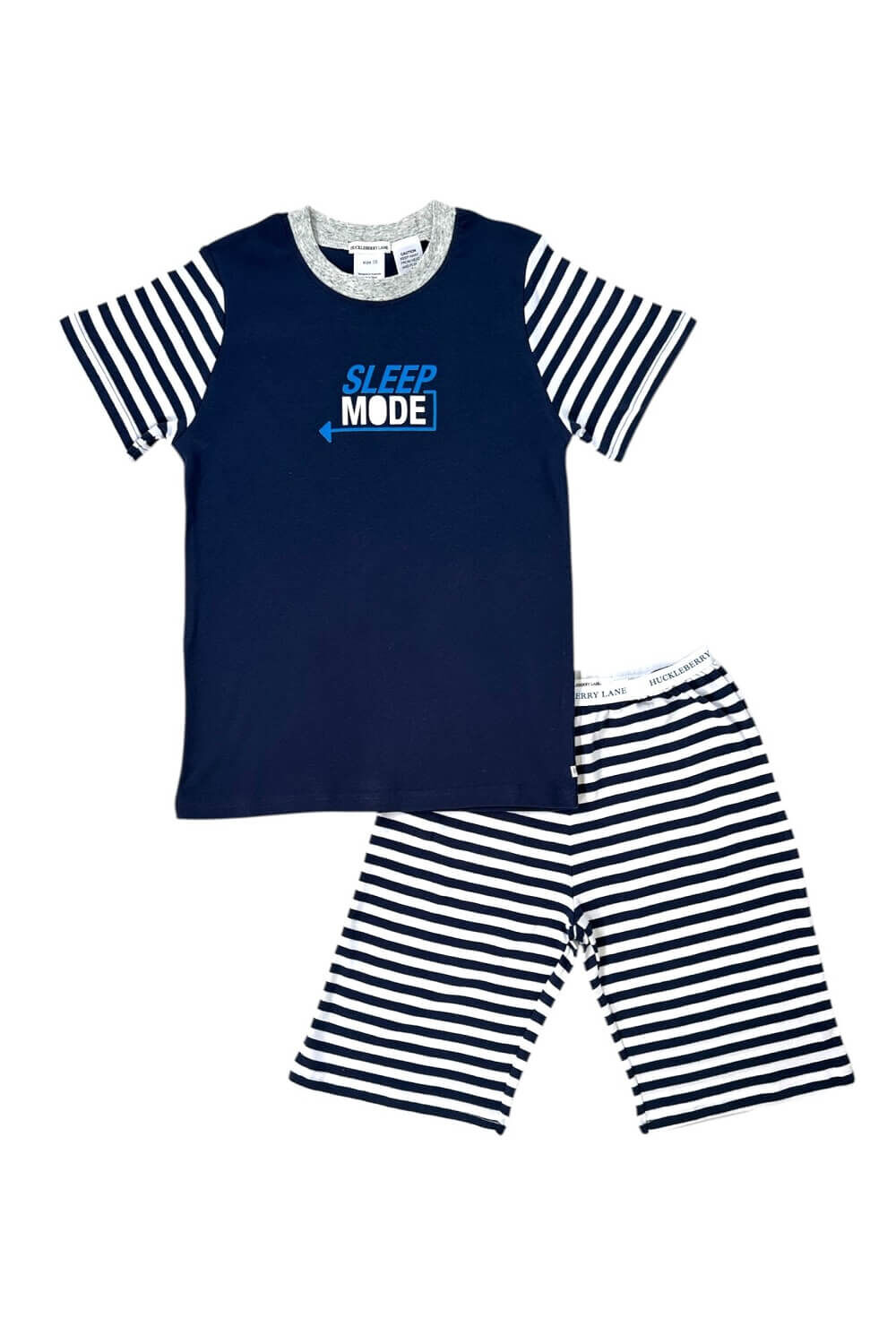 The short sleeve navy top features navy-and-white striped sleeves and a bold Sleep Mode chest print, creating a fun, modern look boys and teens love. Paired with relaxed-fit shorts in a fine navy-and-white stripe, this set offers unrestricted movement perfect for bedtime, weekend lounging, and slow morning starts.