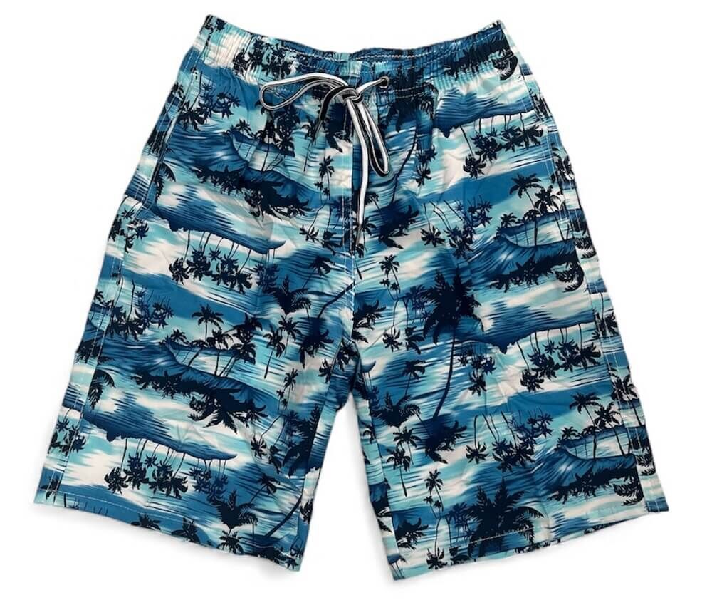 The blue tropical palm print gives these shorts a bold summer look, making them ideal for pool days, surf sessions, family holidays and everyday warm-weather wear. The elastic waistband with a tie drawstring provides a secure and adjustable fit, while the side pockets add convenience for storing small essentials when out of the water.