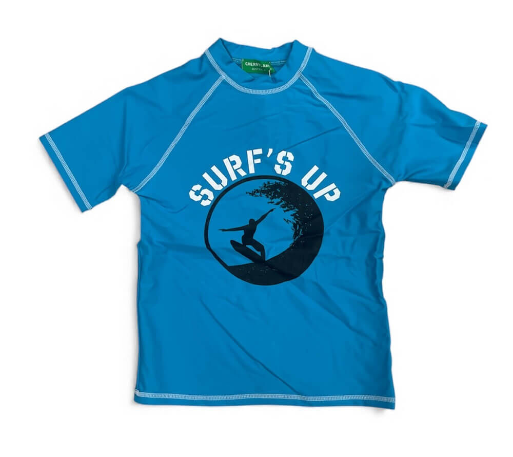 Boys Size 8-16 Aqua Blue Surfs Up Summer Short Sleeve Rash Top Bathers Swimwear UPF50+