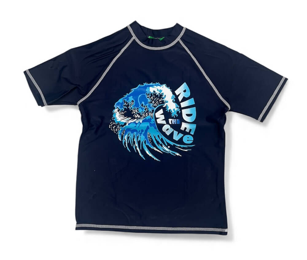 This swim top comes in a deep navy blue with a bold “Ride The Wave” graphic and wave illustration across the chest, giving it a cool surf-inspired style boys love. The white contrast stitching enhances the sporty look while reinforcing the seams for added durability during beach play, pool sessions and water sports.