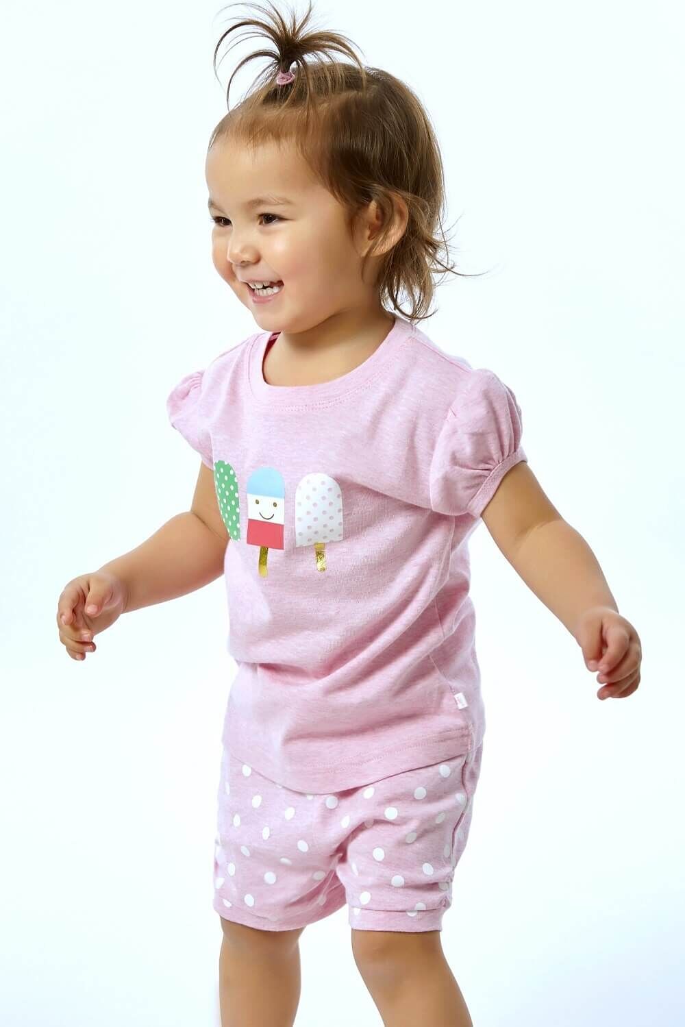 The soft blush pink short sleeve top features a charming icy pole print that captures the fun of summer, while the matching pink shorts with playful polka dots add a cheerful contrast. The relaxed fit allows for unrestricted movement, making this set ideal for active little sleepers and cosy bedtime routines alike.