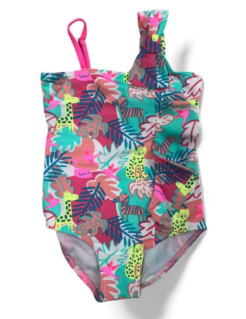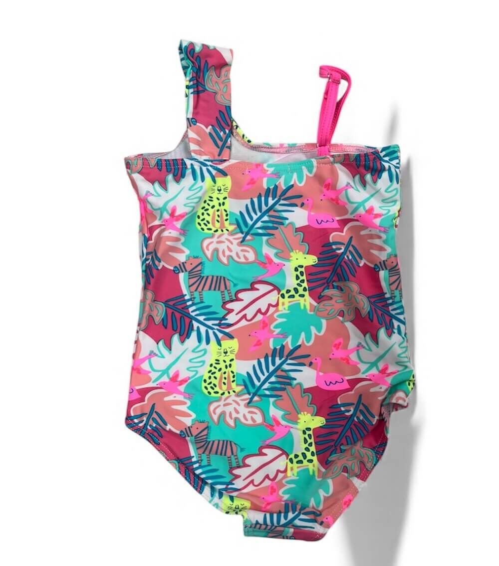 Featuring a vibrant jungle animal and floral print, this swimsuit stands out with its cheerful colours and fun tropical theme. The design includes an adorable shoulder bow detail and a secure adjustable strap, ensuring a custom, comfortable fit for active kids. Whether it’s for swimming lessons, splash parks, pool parties, holidays or daily warm-weather play, this one piece offers both practicality and a cute summer look.