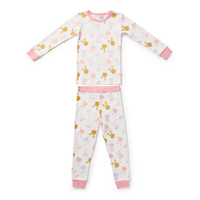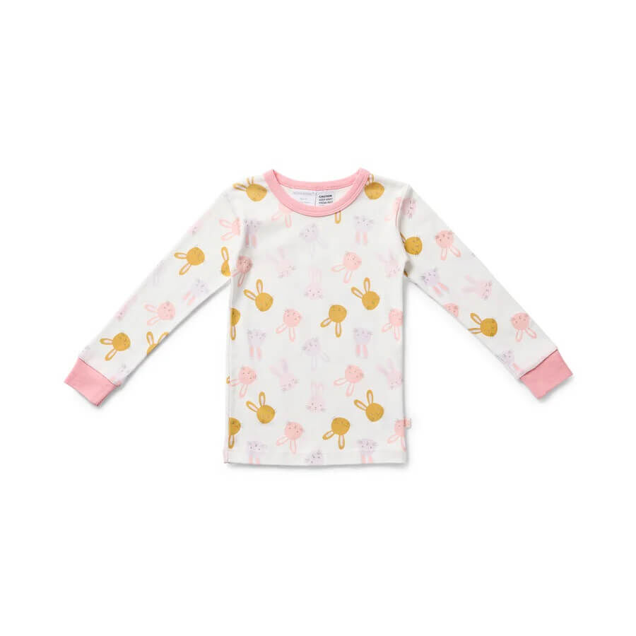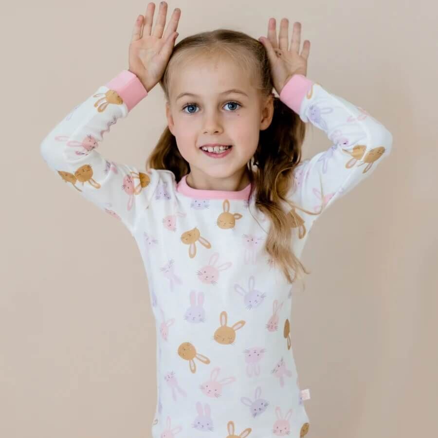This adorable two-piece girls pyjama set features a long sleeve top with a playful bunny print in soft shades of pink, lilac and mustard, creating a sweet and cheerful bedtime look. The matching full-length pyjama pants are designed with a soft Marquise branded elastic waistband, providing a comfortable and flexible fit that allows easy movement during sleep.