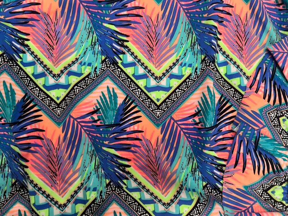 - Aqua blue base with colourful Aztec palm frill overlay