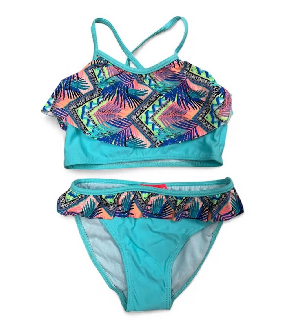 Get ready for summer fun with this Girls Aqua Blue Aztec Palm Tankini Set, designed for active kids who love swimming, beach days and holiday adventures. Available in sizes 8–14, this vibrant two-piece swimsuit features a colourful Aztec palm print frill overlay that adds movement and style, making it a favourite choice for tween girls wanting both comfort and confidence.