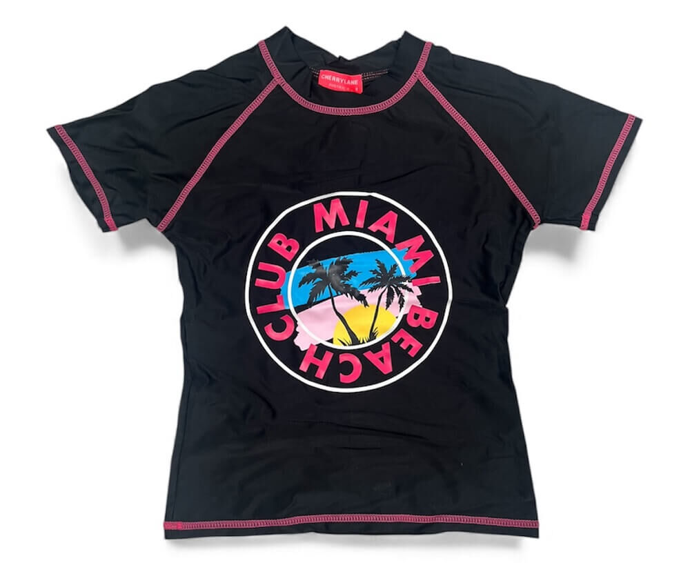 The sleek black base is elevated with a bold Club Miami Beach palm tree print across the chest, creating a trendy summer look inspired by surf culture and tropical destinations. The contrast pink stitching adds a sporty touch while reinforcing seams for extra durability during active water play.