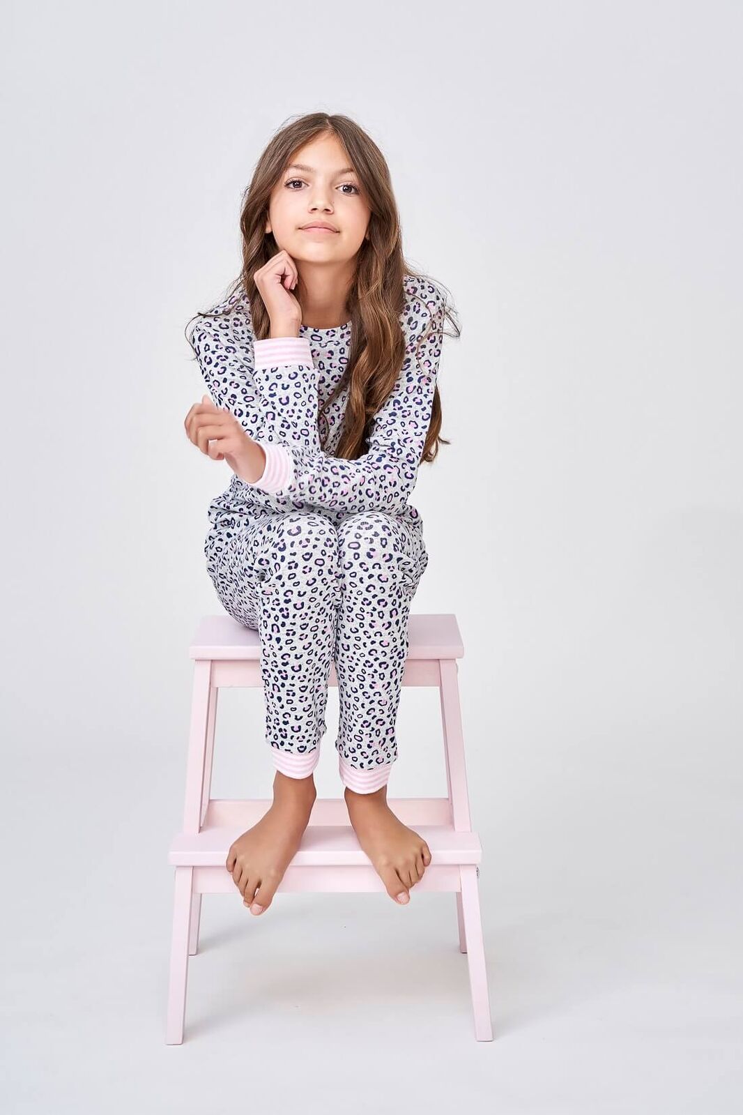 • Matching leopard print pants with elastic waist and pink contrast cuffs