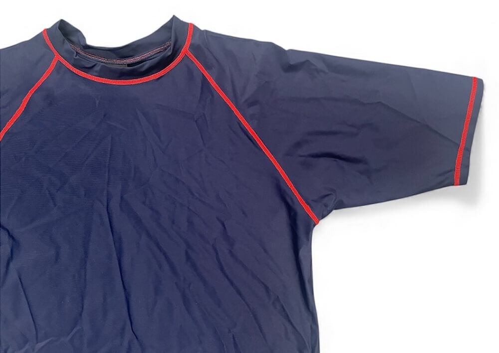 NOTE: Model is wearing a navy blue rash top with white stitching.