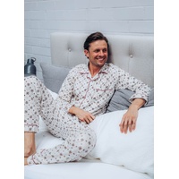 The full-length pants are designed with an elastic waistband for a secure yet flexible fit, along with a button-secured fly opening for convenience. The matching long-sleeve button-up top includes a practical breast pocket, combining classic nightwear style with everyday functionality.