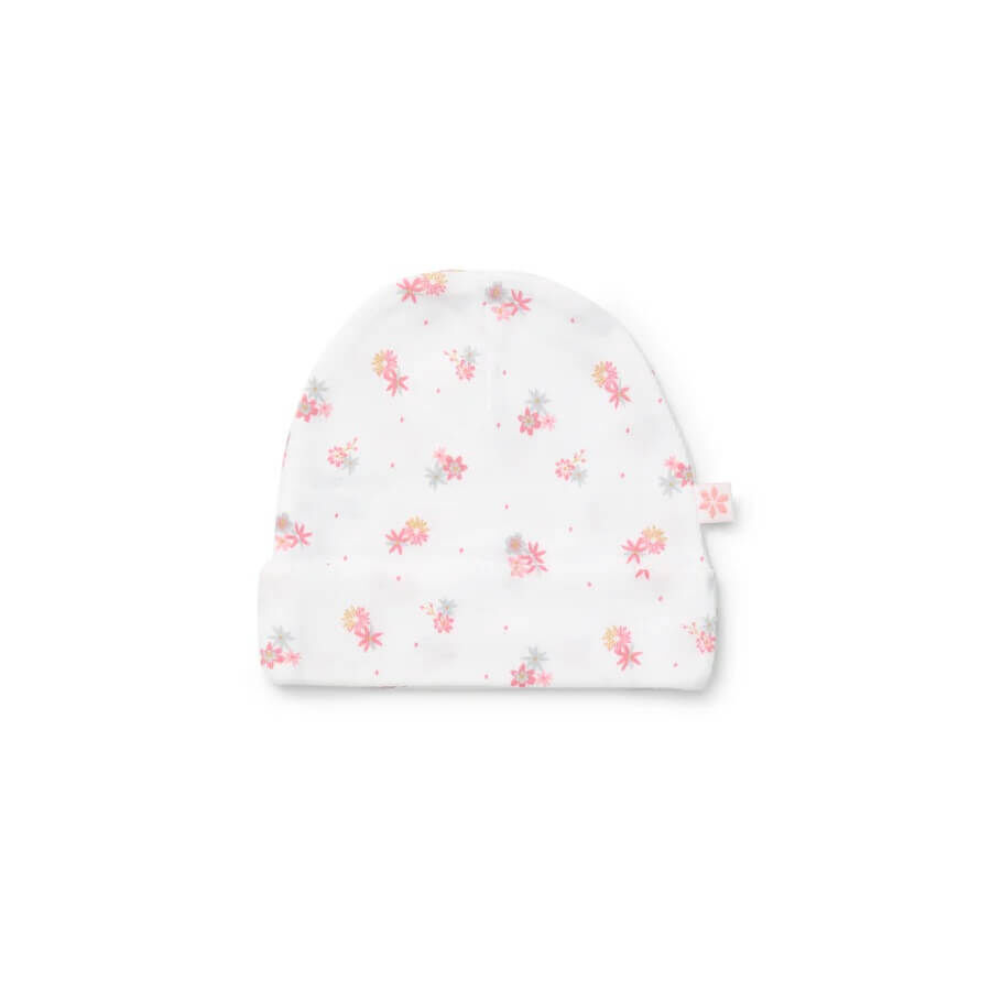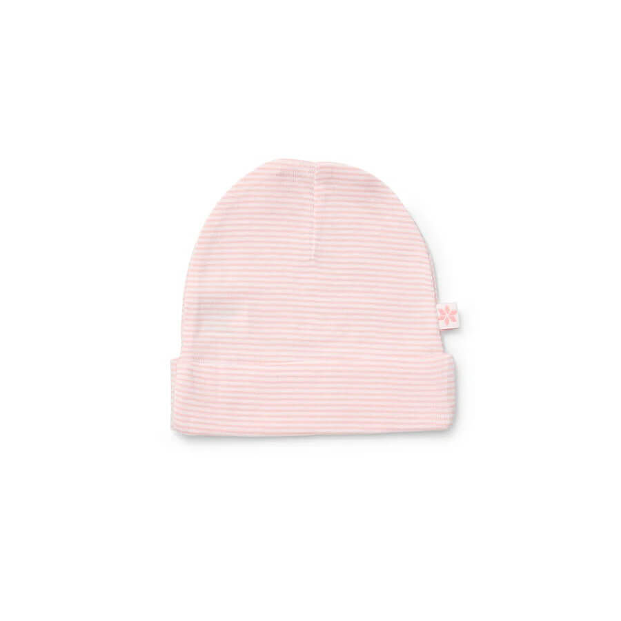 Each pack includes two versatile designs: one crisp white beanie with a delicate floral print, and one classic pink and white stripe beanie. Featuring a fold-over edge for a secure fit, these beanies are both practical and stylish, perfect for everyday wear, outings, or as part of your baby’s hospital bag essentials.