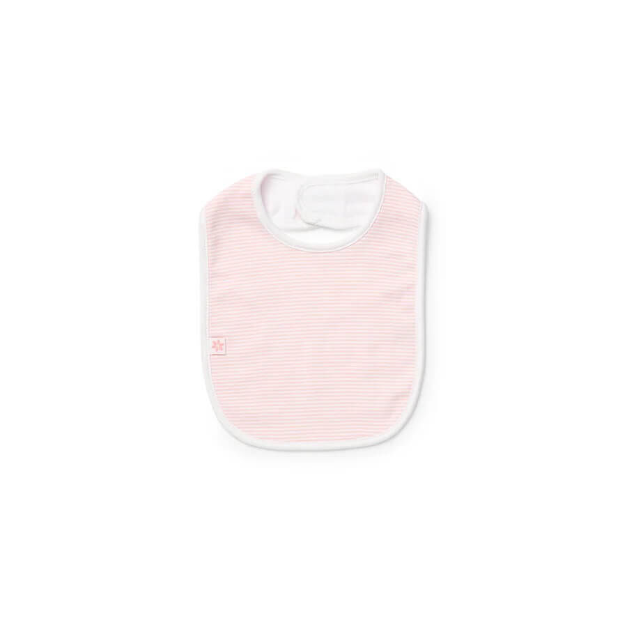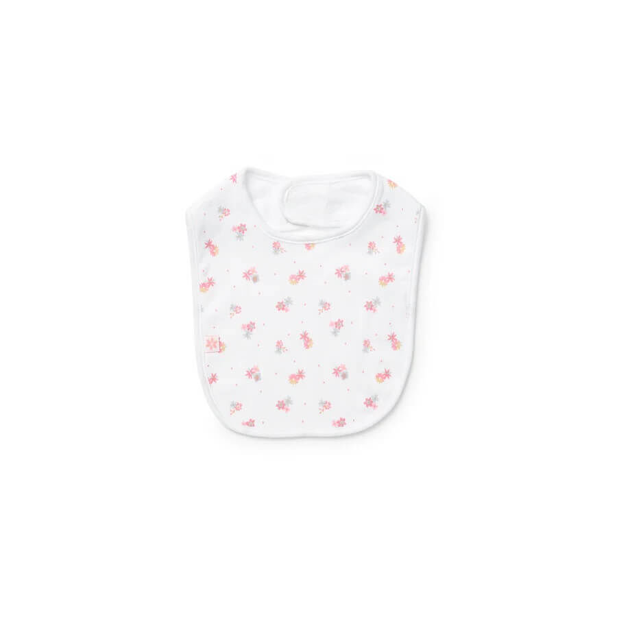 Each pack includes two adorable designs: one crisp white bib with a delicate floral print, and one in a classic pink and white stripe. Both are secured with gentle velcro fastenings, making them easy to put on and remove while ensuring a comfortable fit against delicate skin.
