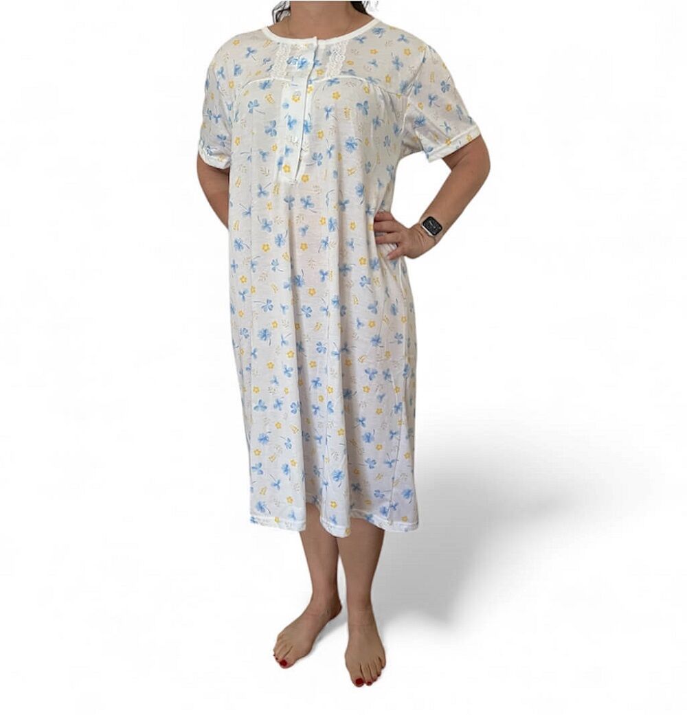 Experience easy summer nights with our Womens White Blue Yellow Floral Short Sleeve Cotton Nightie. Designed for warm weather and everyday comfort, this feminine nightdress combines lightweight breathability with timeless floral charm.