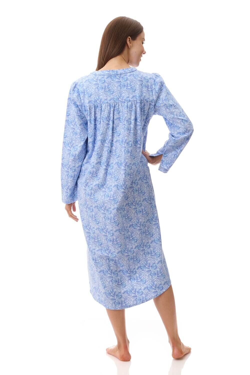 The "Kora" mid length nightie features a classic blue print that offers a timeless and elegant look, perfect for everyday wear. The brushed cotton flannel fabric provides insulation while remaining lightweight against the skin, making it a popular choice for those searching for warm cotton nighties, flannelette nightgowns, and breathable winter sleepwear for women in Australia.