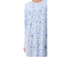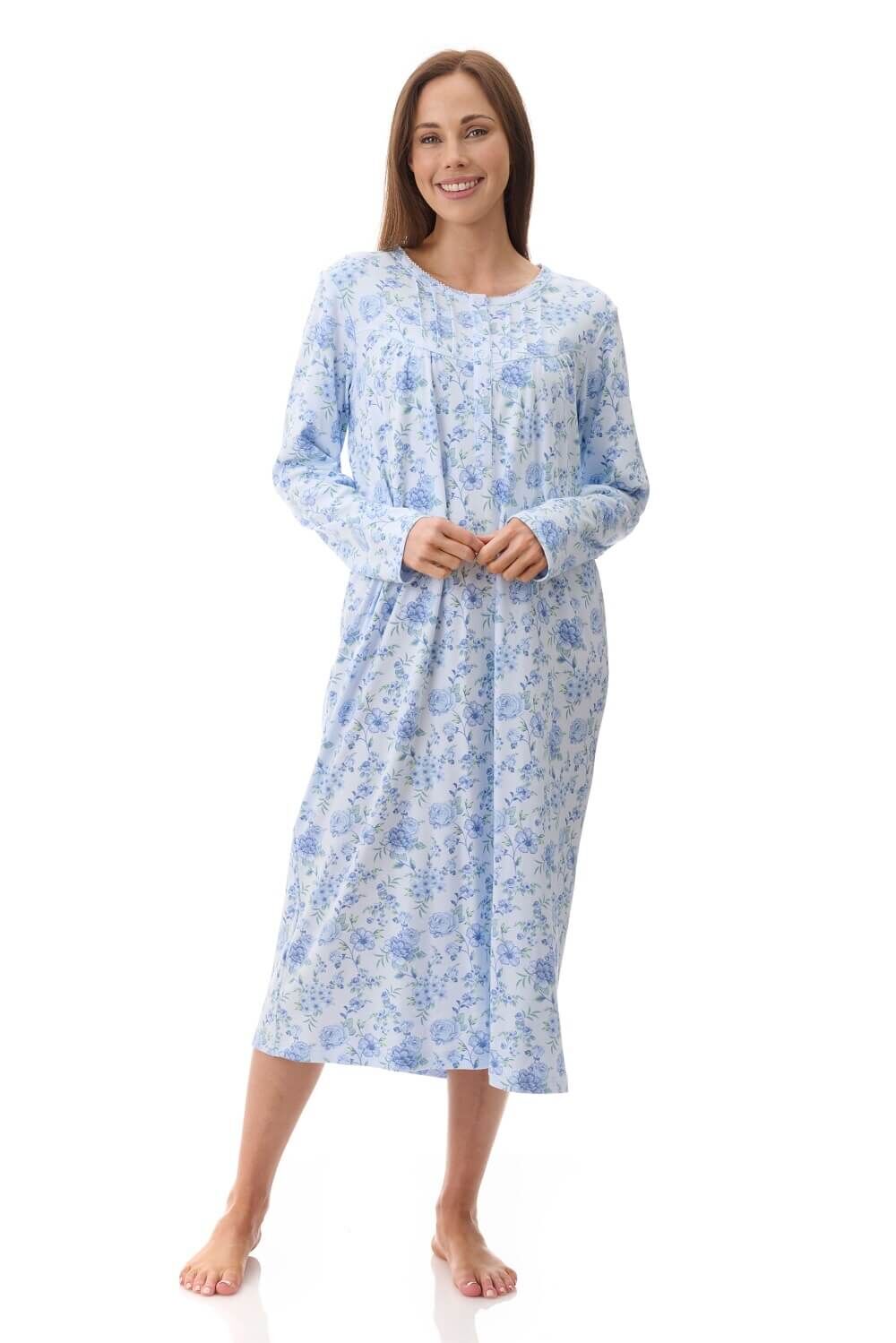 The "Mira" mid length nightie features a classic blue floral print, combining timeless design with practical comfort. The cotton interlock fabric provides a warmer alternative to lightweight cotton while remaining breathable, making it perfect for those searching for warm cotton knit nighties, winter nightgowns, and comfortable ladies sleepwear in Australia.