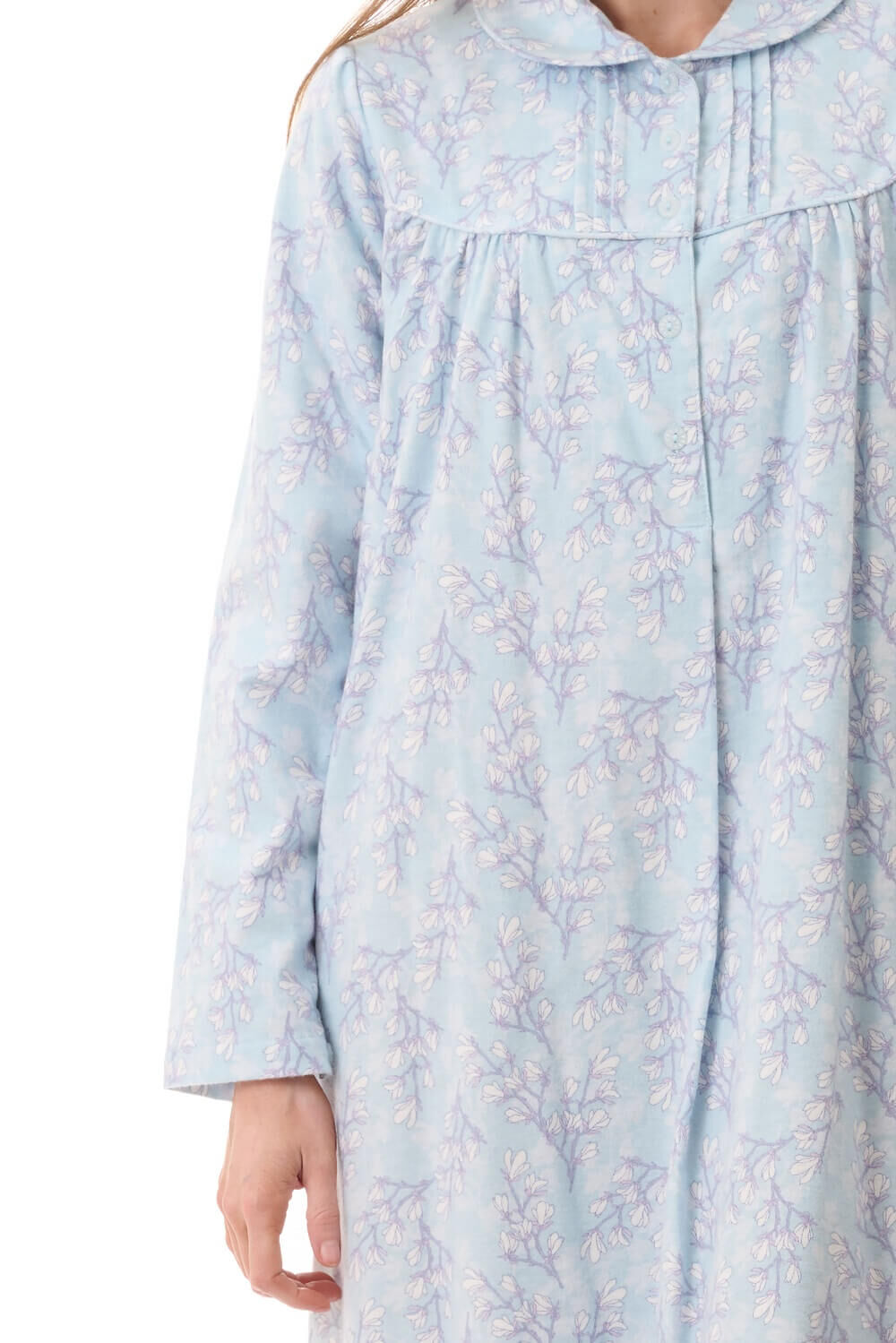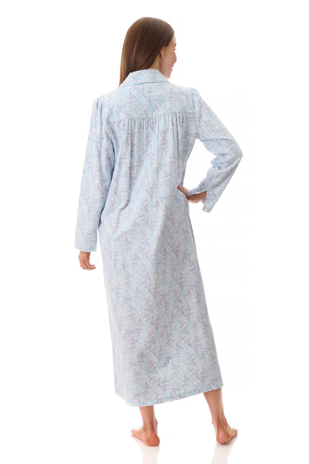 Designed with both comfort and elegance in mind, this ladies winter nightie includes a classic collar and full front button placket for ease of wear. The curved front yoke with self piping and delicate tuck detailing adds a refined touch, while soft gathering from the front yoke creates a relaxed fit that allows for movement and all-night comfort.