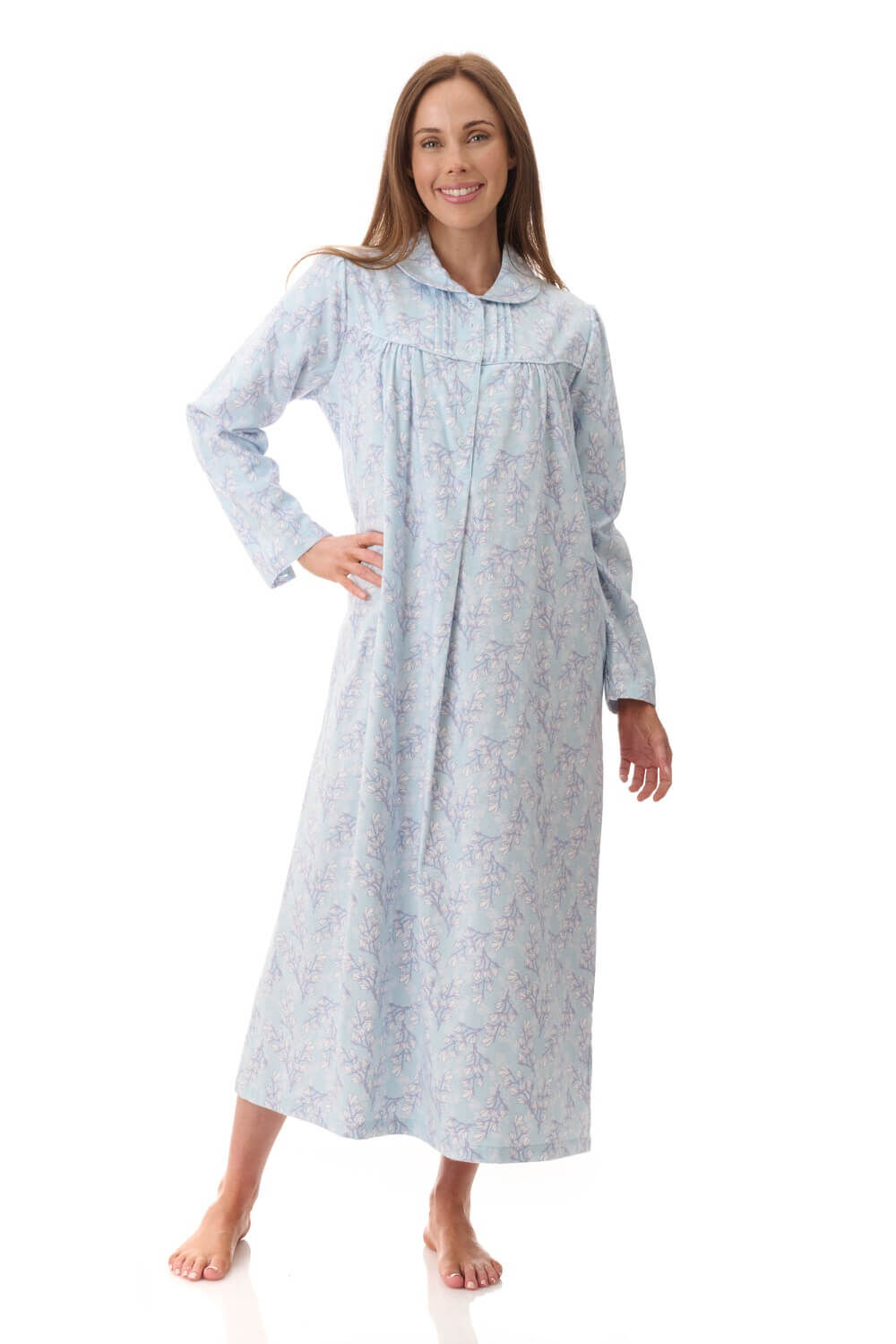 The "Jamie" long length nightie features a soft mint print that brings a fresh and calming look to your nightwear wardrobe while maintaining a timeless and feminine style. The high-quality cotton flannel fabric is warm yet breathable, making it perfect for those searching for long flannelette nightgowns, warm cotton nighties, or comfortable winter sleepwear for women in Australia.