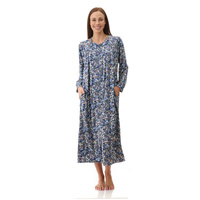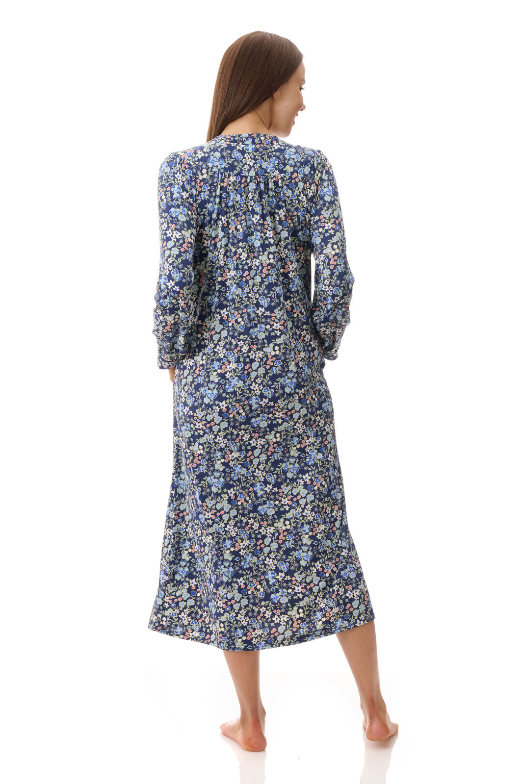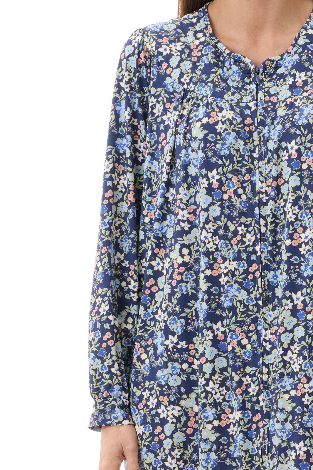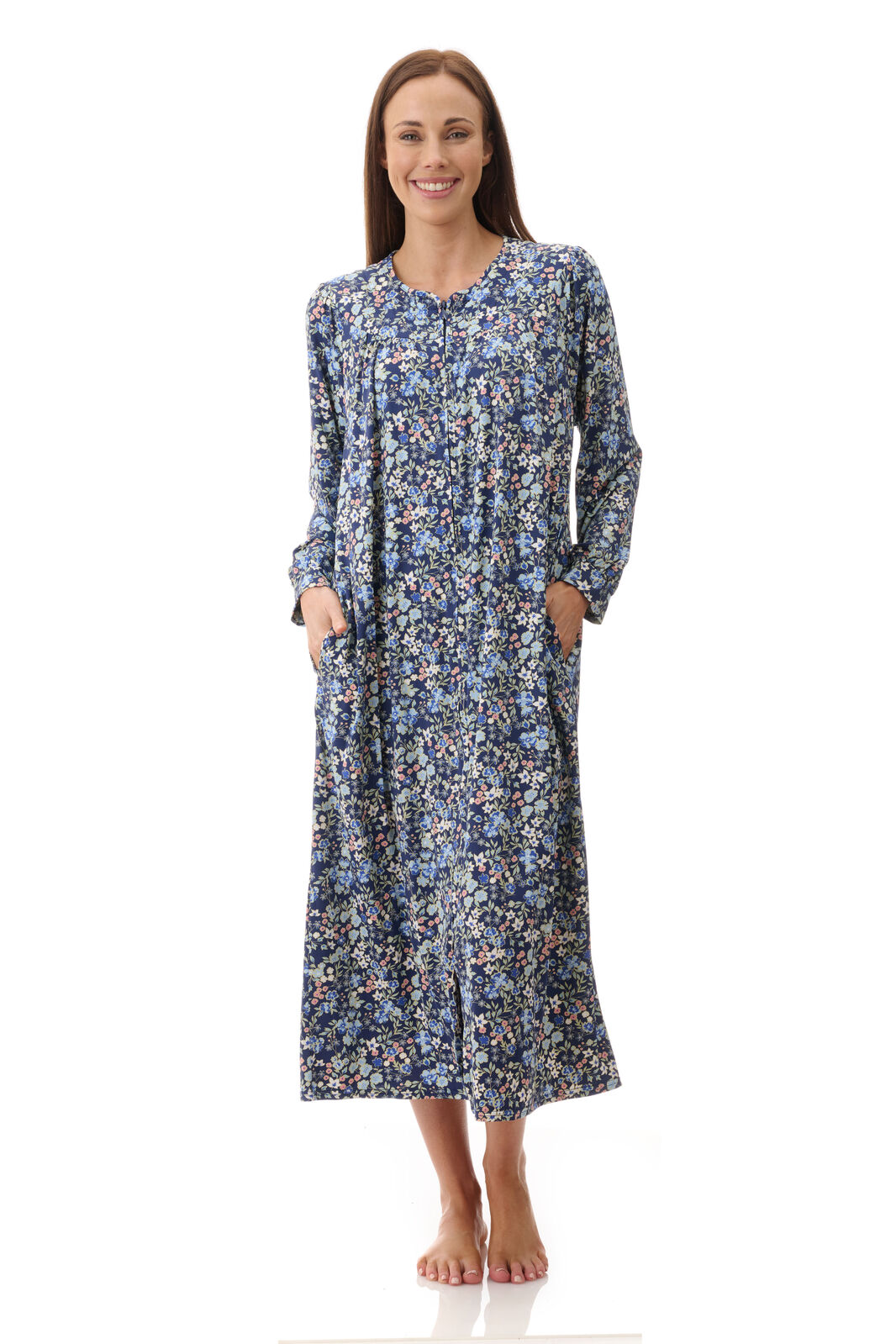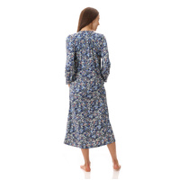 The "Ariel" long sleeve brunchcoat features a rich navy blue floral print, delivering a timeless and elegant look that complements any winter sleepwear collection. The silky knit fabric, made from a nylon and elastane blend, provides gentle stretch and freedom of movement, making it perfect for those searching for zip front robes, lightweight dressing gowns, or comfortable women’s lounge robes in Australia.