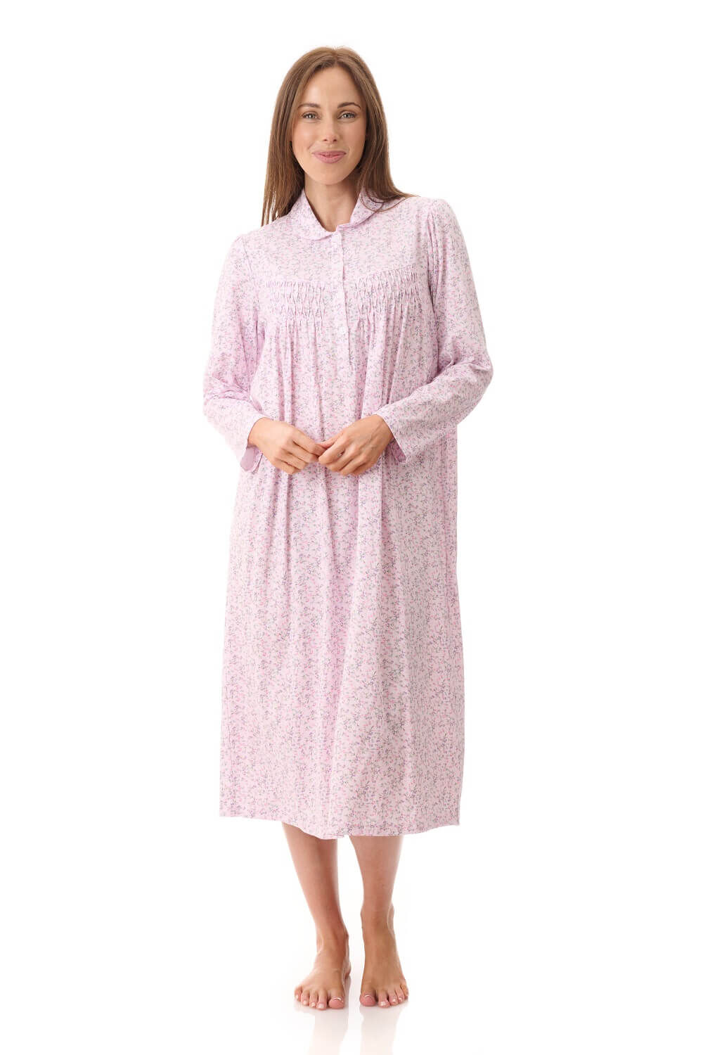 Made from 100% cotton, this women’s winter nightie offers natural breathability while keeping you cosy on cooler nights. The soft pink “Thea” floral print creates a classic, feminine look ideal for all ages, whether shopping for yourself or choosing a thoughtful gift.
