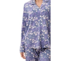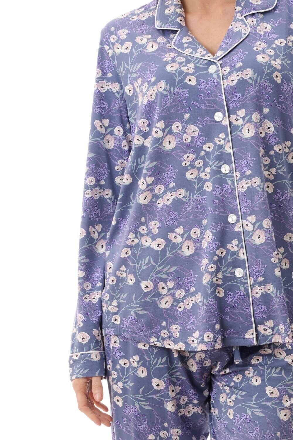 The elegant “Elaine” dusk floral print in rich purple tones adds a sophisticated and feminine touch, making it a standout piece in any sleepwear collection. The long sleeve top features a classic button front opening, structured collar, and shaped hemline for a flattering fit. Finished with contrast white satin piping and a chest pocket, this design combines style with practicality.