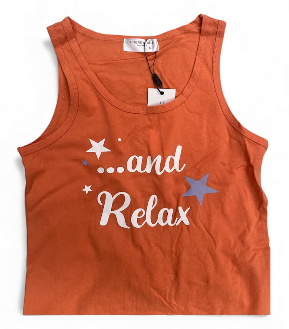 - “Relax” slogan with star print on the front