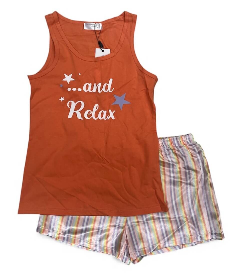 Unwind in comfort with this Women’s Orange Relax Cotton Singlet & Satin Shorts Pyjama Set, designed for warm summer nights and effortless lounging. The soft 100% cotton singlet top comes in a fresh, warm orange shade and features a calming “Relax” slogan with star accents, creating the perfect bedtime mood for unwinding after a long day.