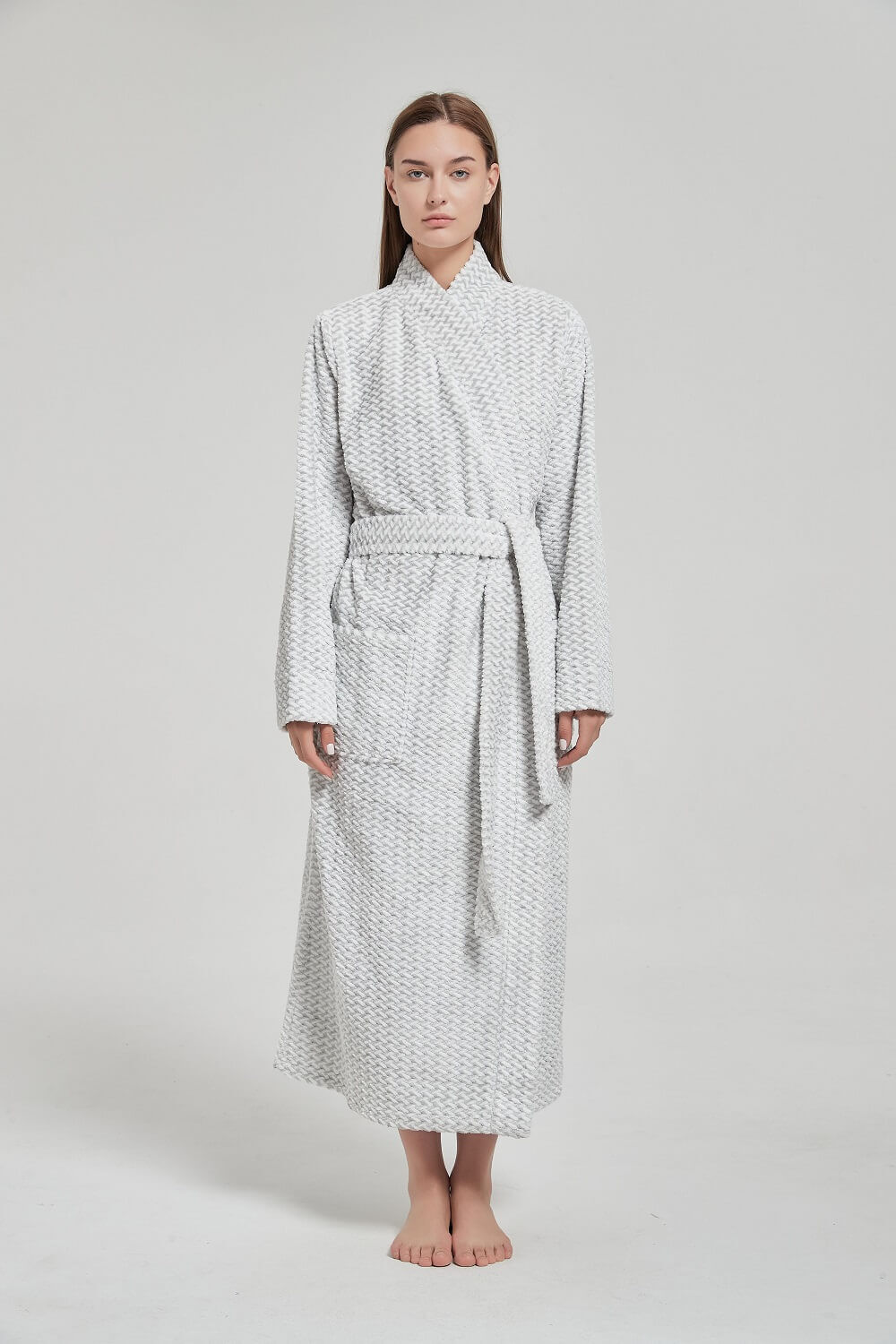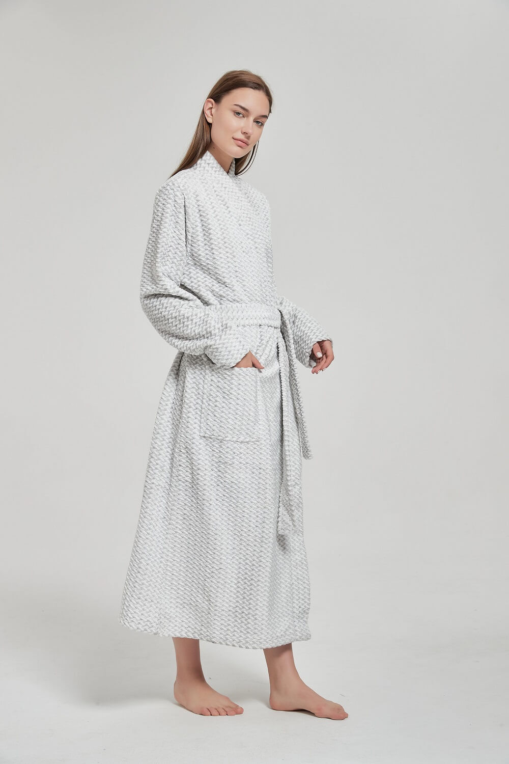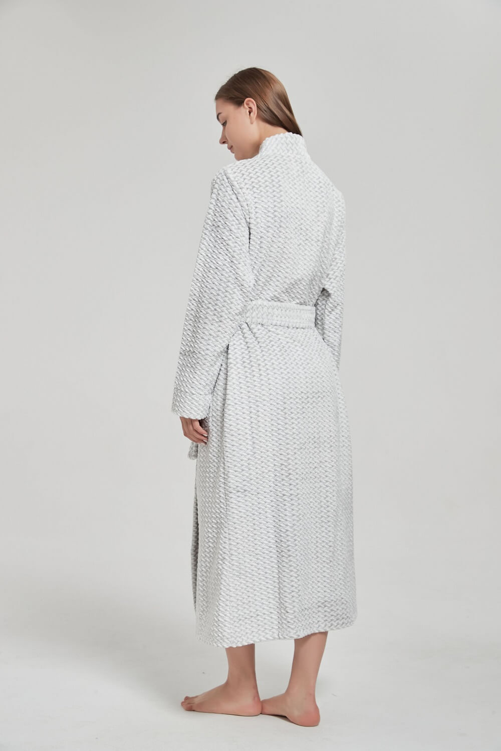Made from soft, insulating polyester fleece, this women’s winter bathrobe provides exceptional warmth while remaining lightweight and breathable for all-day wear. The elegant grey colour is complemented by a subtle embossed textured pattern, offering a refined and timeless look that pairs effortlessly with pyjamas, nighties and loungewear.